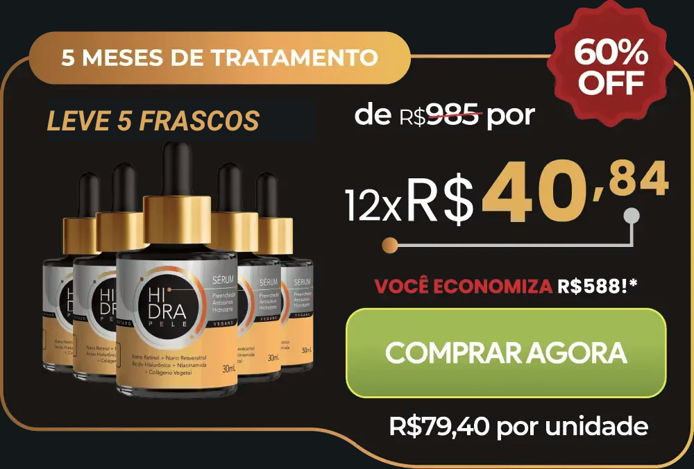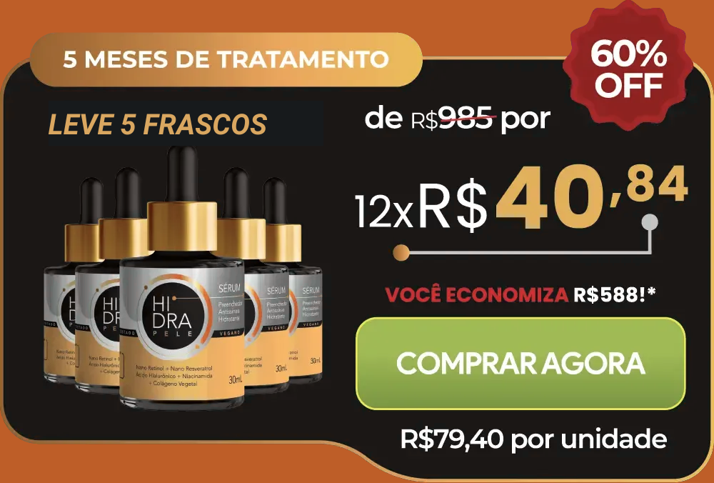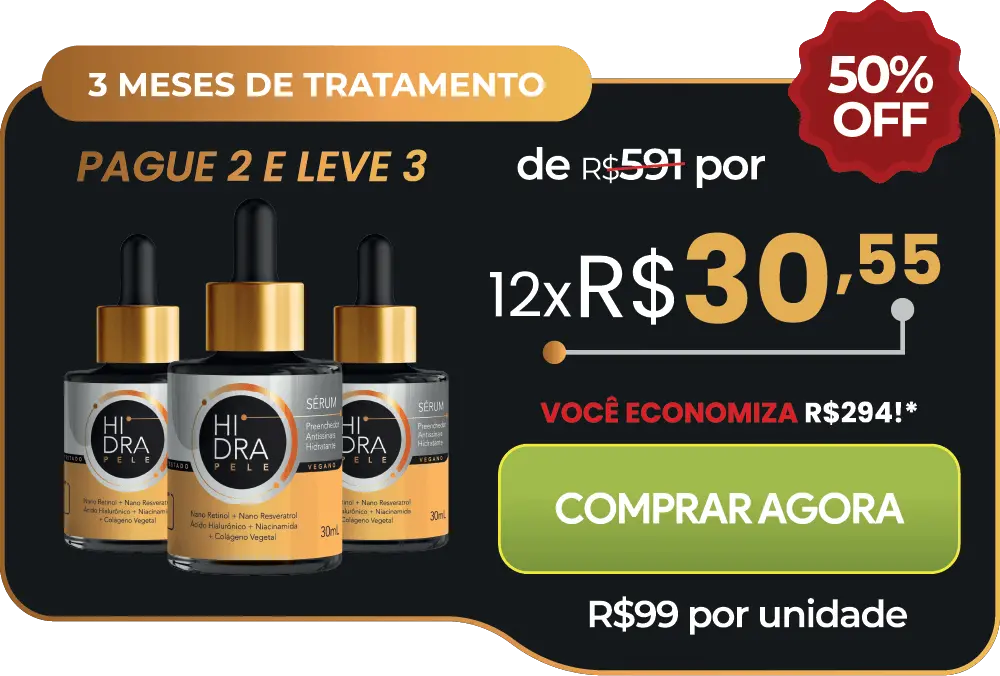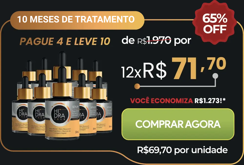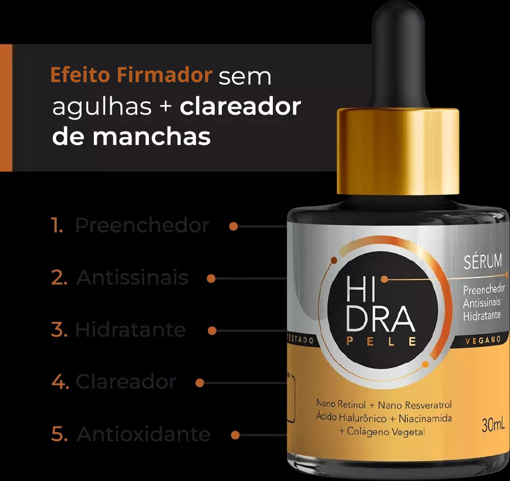 O Sérum HidraPele acelera a renovação celular, deixando sua pele mais jovem e saudável ao longo dos anos. Não se preocupe mais com as mudanças negativas que a idade traz – experimente e se sinta mais confiante e atraente a cada dia. Não deixe a idade definir sua aparência – descubra uma nova e mais jovem versão de si mesmo(a)